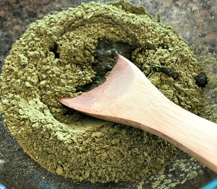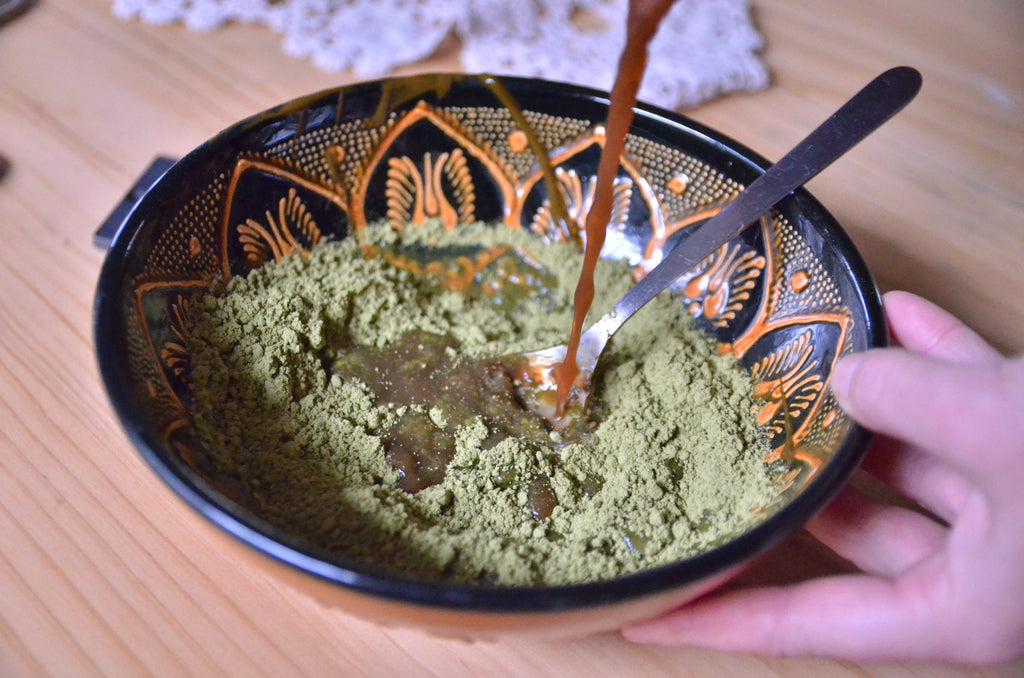 Faire chauffer de l'eau jusqu'à ce que celle-ci frémisse ; Versez et mélangez à la poudre de henné jusqu'à l'obtention d'une pâte onctueuse.