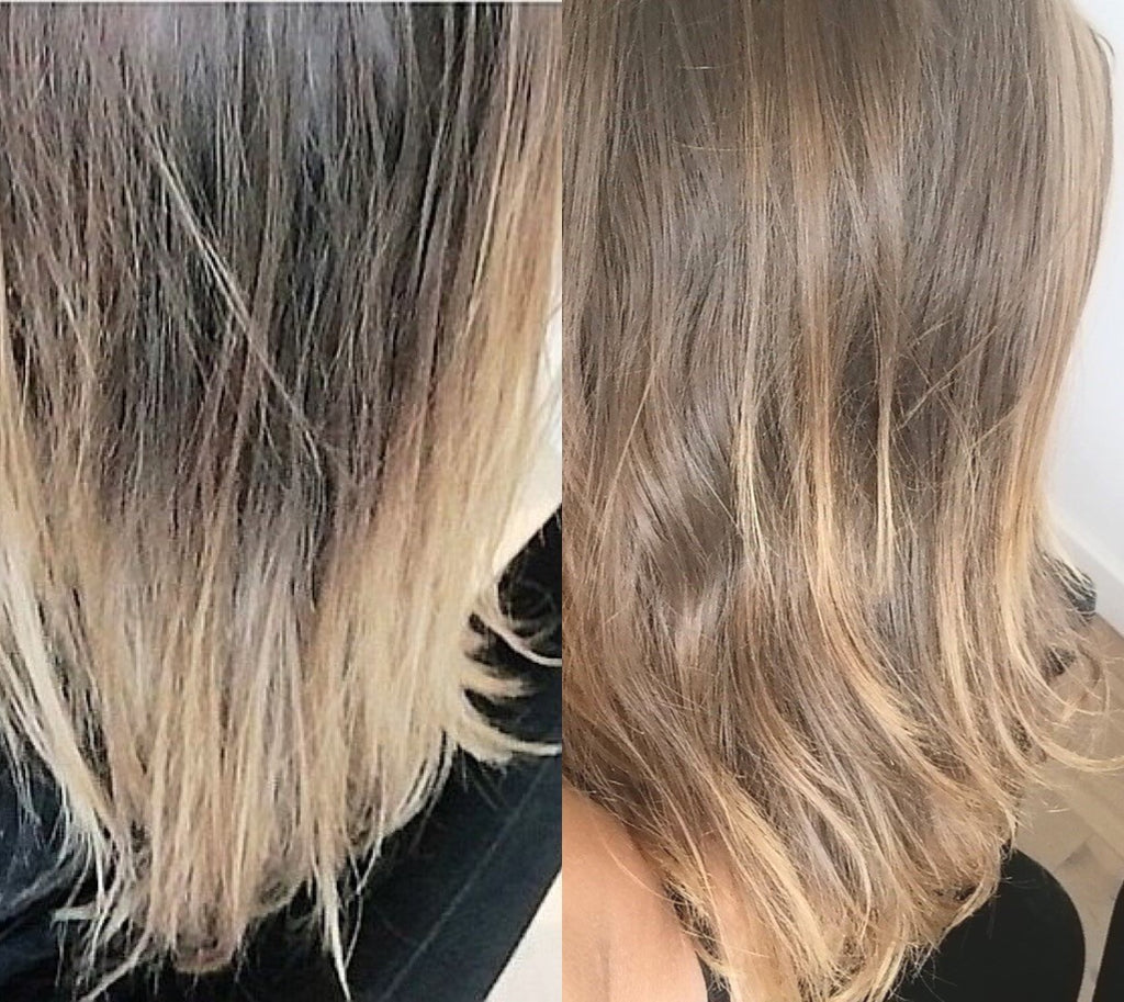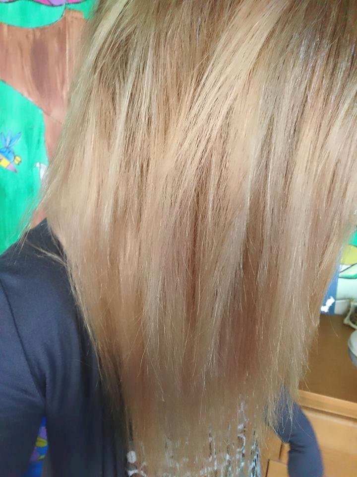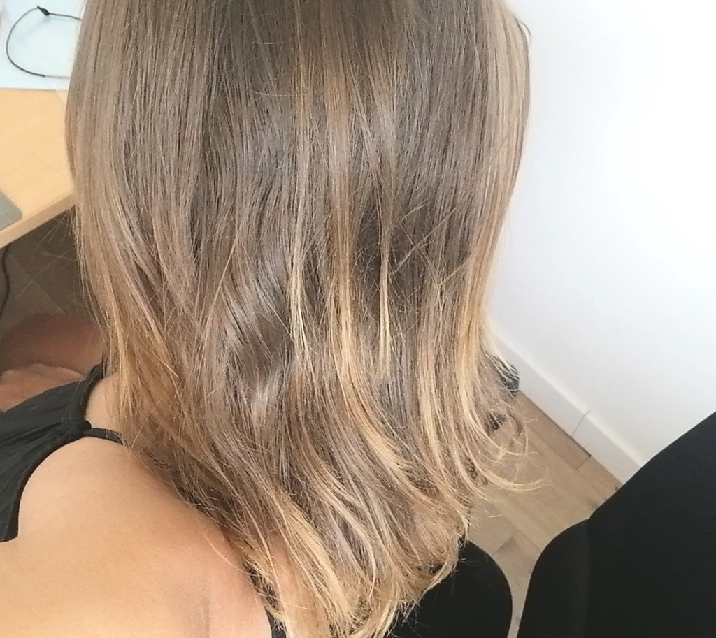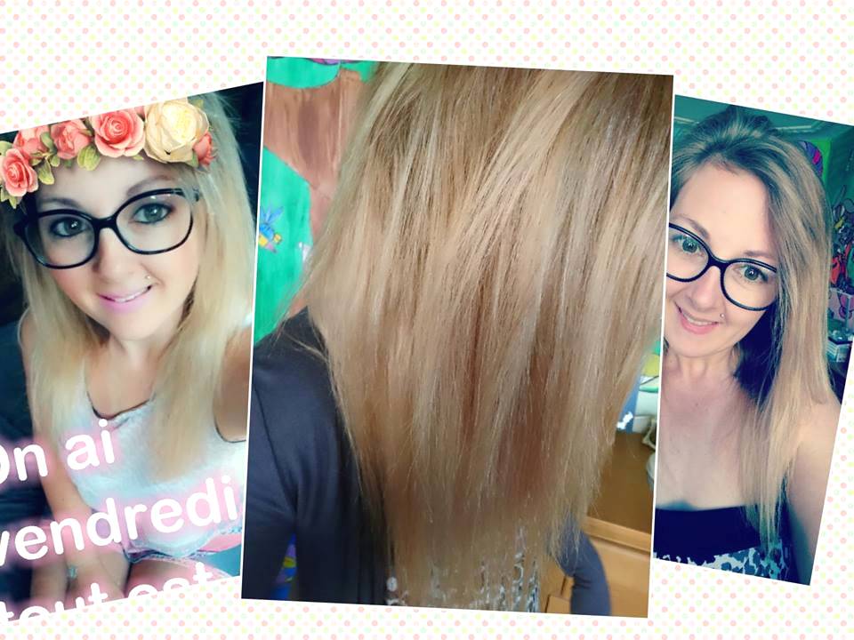Ci-dessous, une photo "avant / après" d'une cliente qui souhaitait un blond plus froid, moins cuivré (à gauche "avant", et droite "après) :