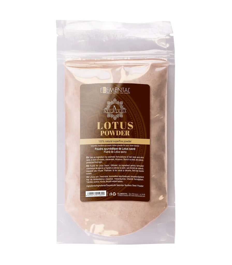 Poudre de Lotus sacré, elemental, propriétés astringentes, purifiantes, peaux grasses à imperfections, illumine le teint, lisse, anti ride, anti oxydant, poudre orange, argile, neem, katam, henne, assainit les pores et traite les peaux grasses et acnéiques, rouge cerise, cheveux violine, aubergine, henné d'algérie