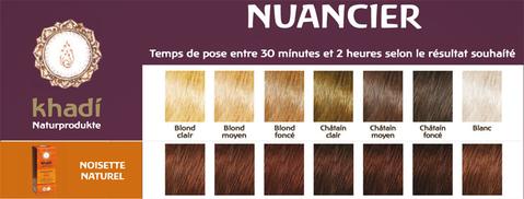 Ci-dessous le nuancier de la coloration Noisette, les cases vides correspondent aux nuances claires pour lesquelles il est nécessaire de réaliser la première étape de coloration au Henné Naturel.