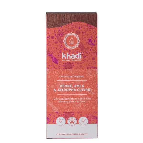 La coloration végétale Henné, Amla & Jatropha donne une couleur rouge cuivrée enflammée et intense, et tire vers l'acajou auburn pour les bases plus foncées.