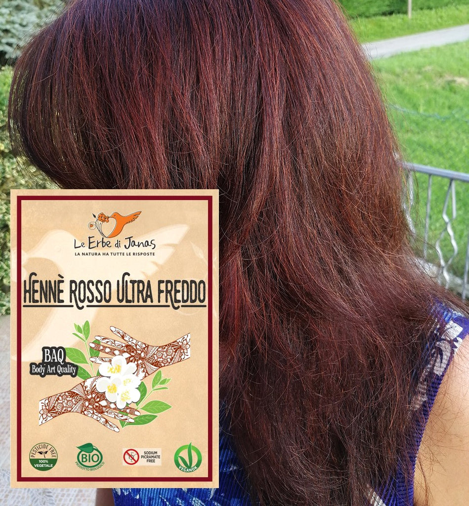 La concentration en pigments colorants du Henné Rouge Violine "Le Erbe Di Janas" apporte des nuances rouges froides ou "cerise" aux cheveux :