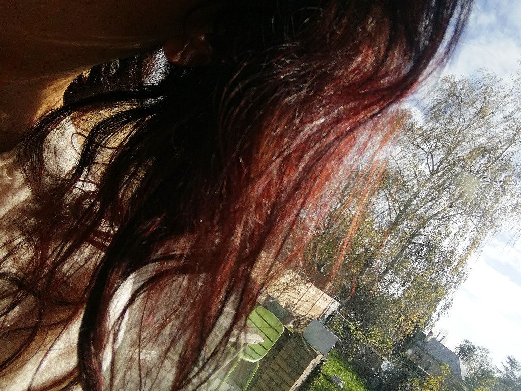 Cheveux châtains foncés à brun : reflets rouge cerise / bleu violet.