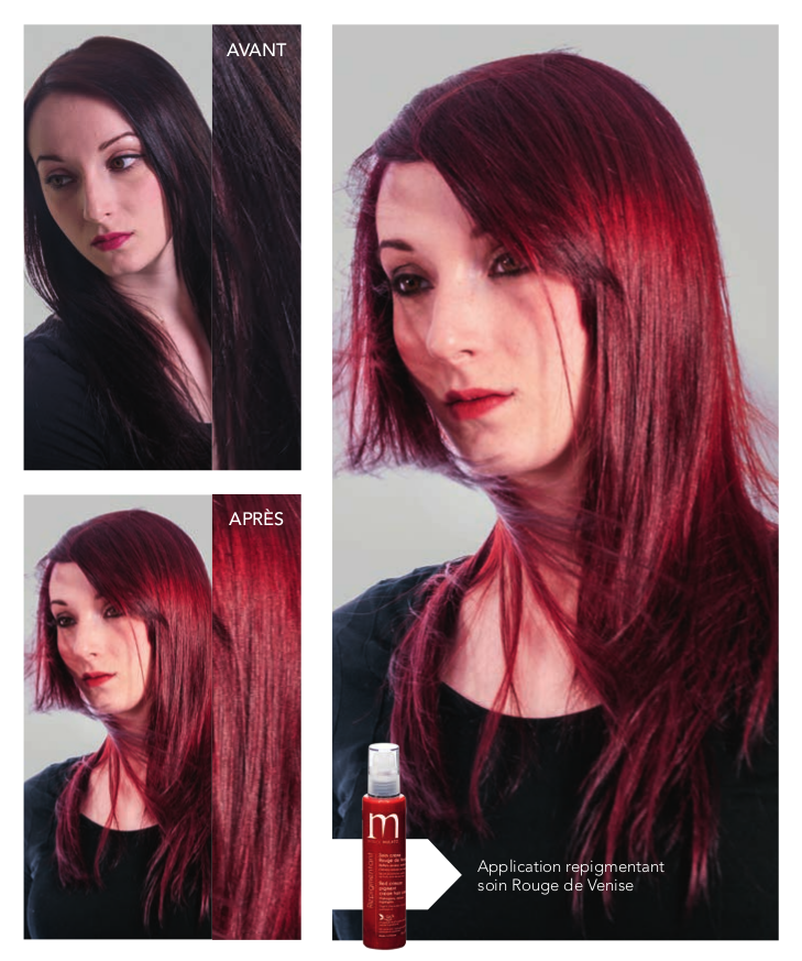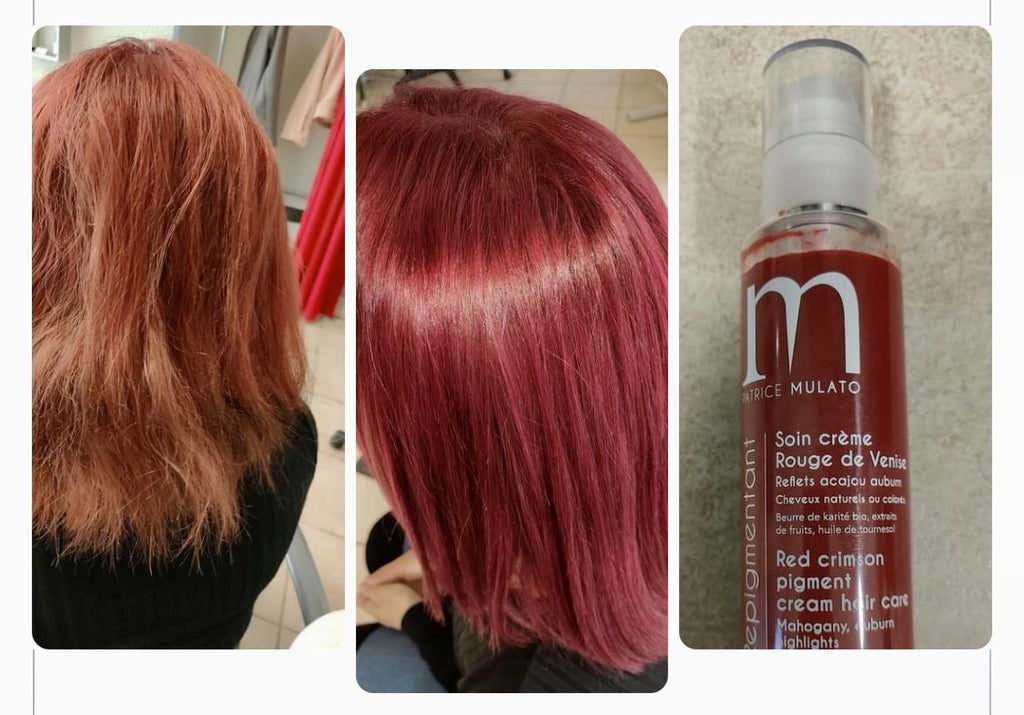 - Sur cheveux naturels, le soin colorant repigmentant Rouge Venise apporte de très beaux reflets auburn, acajou.