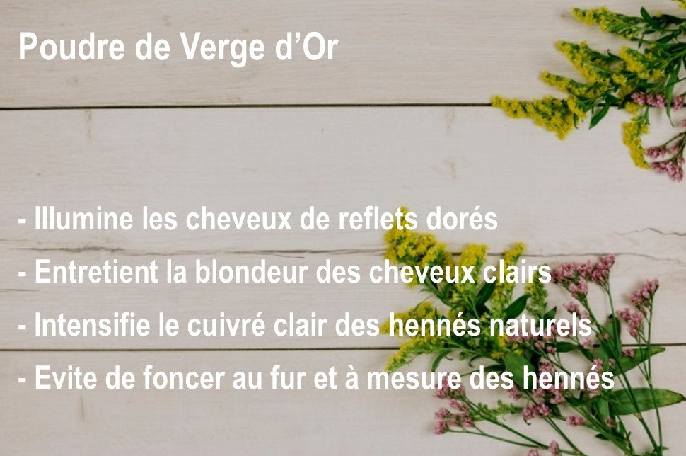 Véritable alliée de la blondeur, la poudre de Verge d'Or est connue pour ses propriétés "blondissantes" sur les cheveux. Elle couvre également les cheveux blancs en nuances dorées.